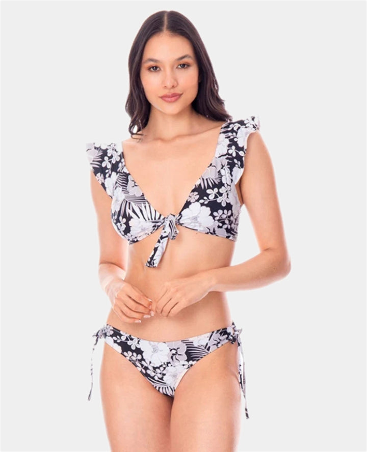 Vestido de baño de dos piezas: Top de anudar en centro, copas removibles, banda elástica en base busto, bolero en mangas que puedes usar caída en los hombros o de manera tradicional. Panty semidescaderado de corte anatómico y anudar en laterales. Poliéster/Elastano.   SKU: 988490300